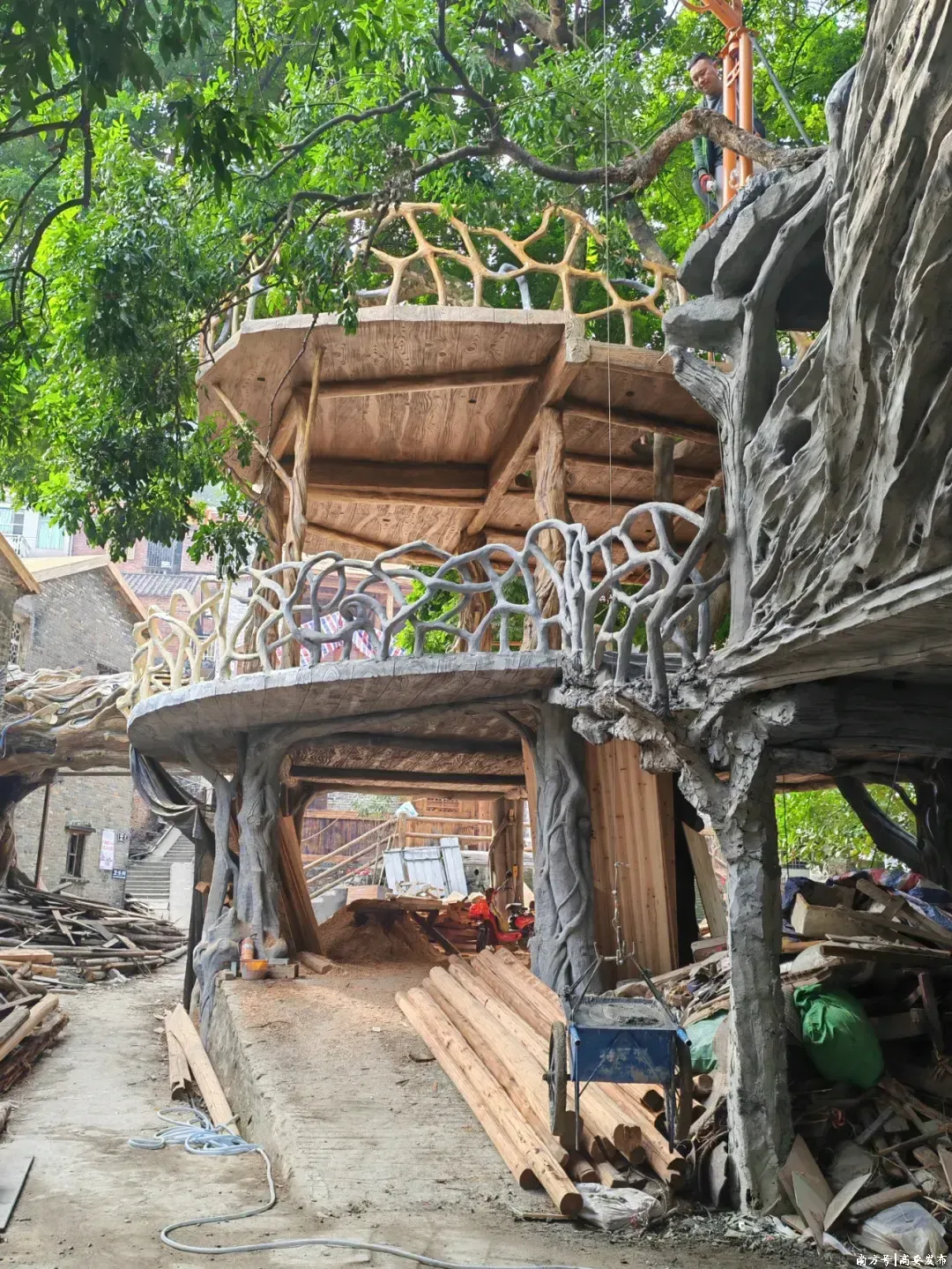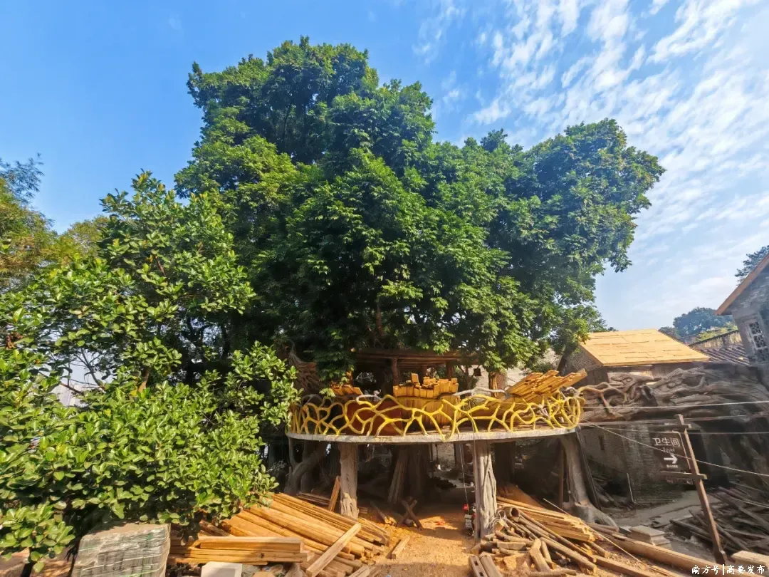 走进上清湾村,机器的轰鸣声与工东说念主的吆喝声连三接二。只见榕树船埠广场上,一个两层半高的钢筋混凝土架子决然赠送,架子的二至三层位置,正在开采仿岩洞的书吧和仿木结构的咖啡屋。